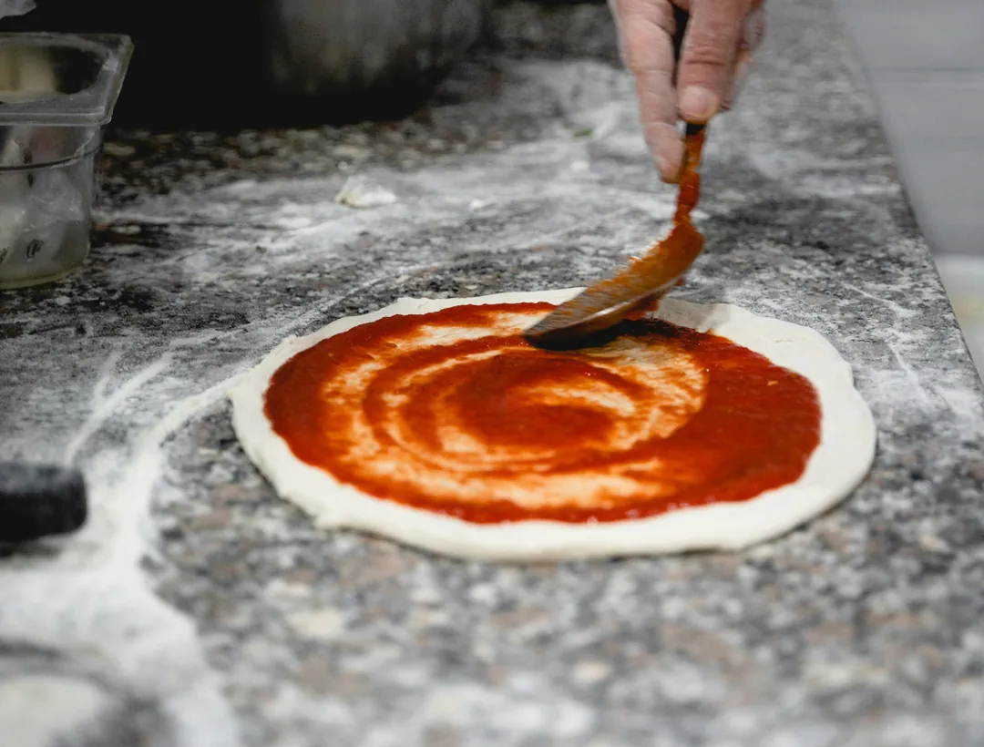 Spread the pizza sauce over the dough, then add a generous amount of shredded mozzarella cheese.